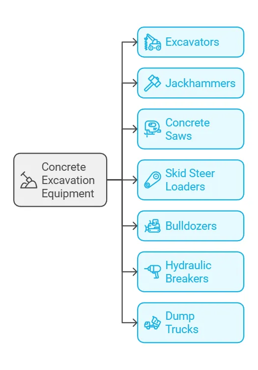 Concrete excavation involves removing concrete to prepare a site for new construction, repairs, or modifications. This process often requires adapting equipment use to overcome challenges such as structural risks, utility navigation, and environmental concerns. The process requires specialized tools and equipment designed to handle various challenges, including breaking, cutting, and removing concrete efficiently. Below are some of the most common tools used in concrete excavation: